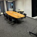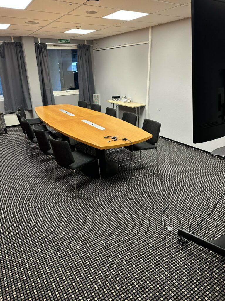 Hasseløy er et moderne møterom med styrebordoppsett for opptil 11 personer – ideelt for ledermøter, intervjuer eller mindre workshops.